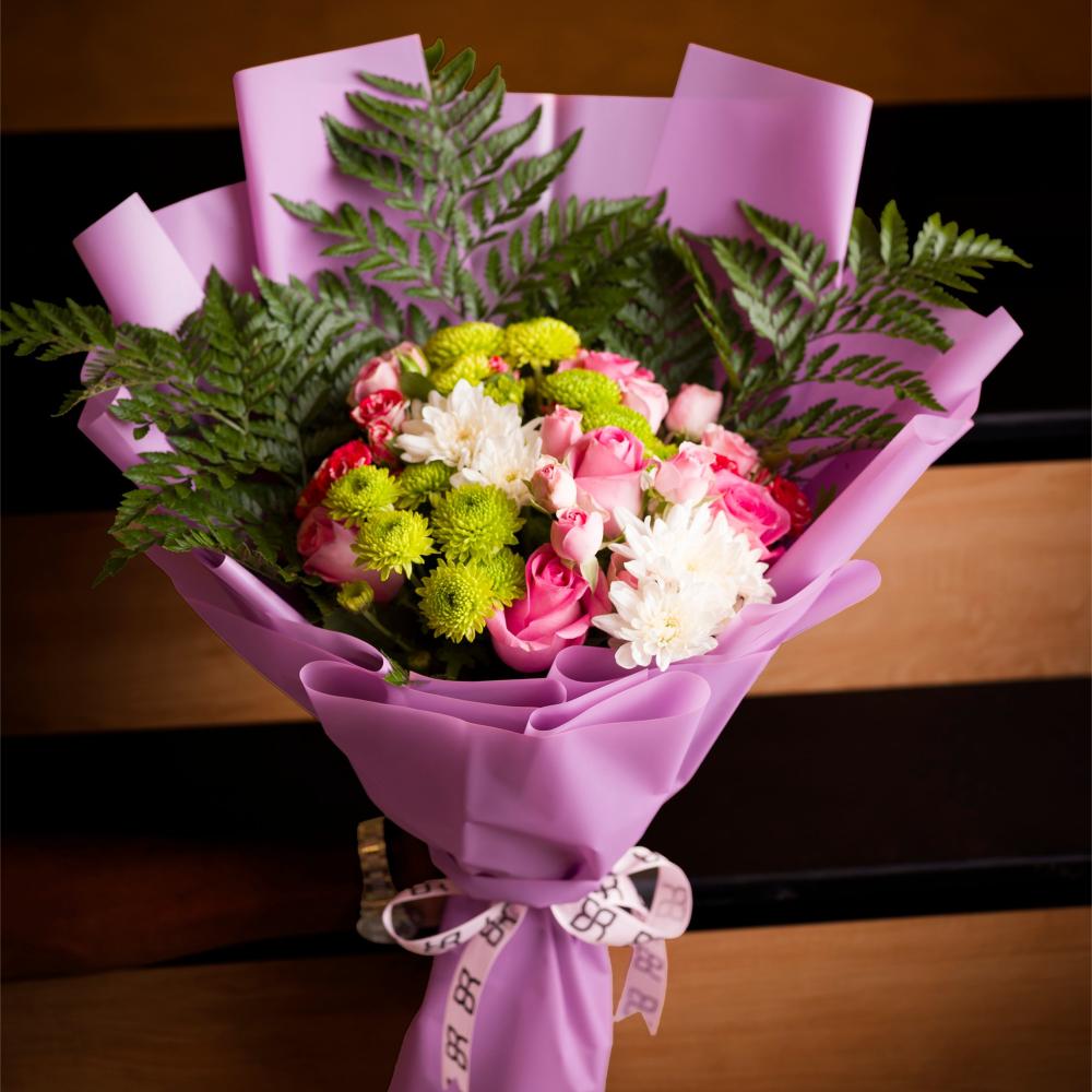 باقة ورد مشكله من الزهور المميزة تضم جوري وبابي جوري وكريز وجرين لفز، تمتاز بتناسق رائع بين الألوان والنوعيات لإضفاء لمسة جمالية لأي مناسبة خاصة.